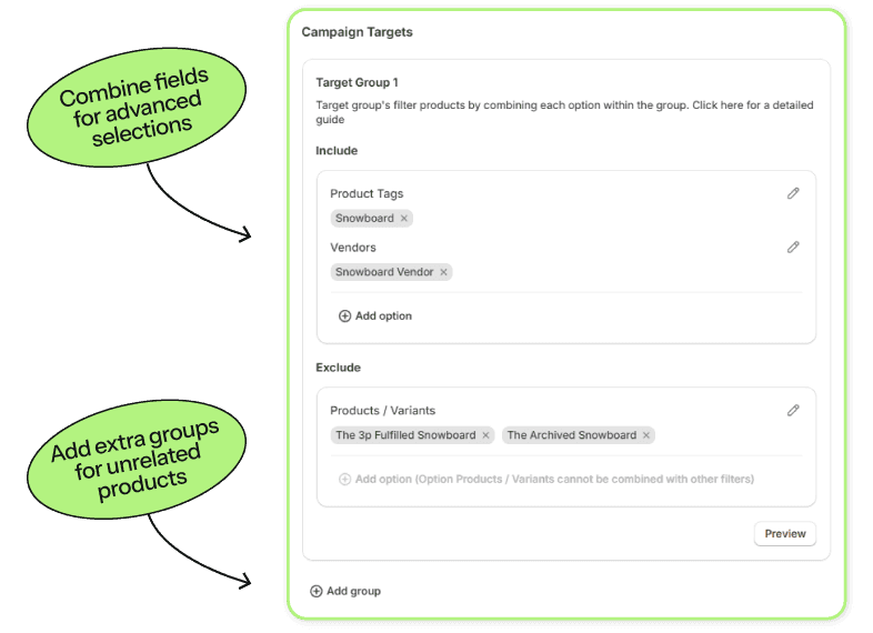 Add or remove tags while the campaign is active. Perfect for creating collections and segmenting products.